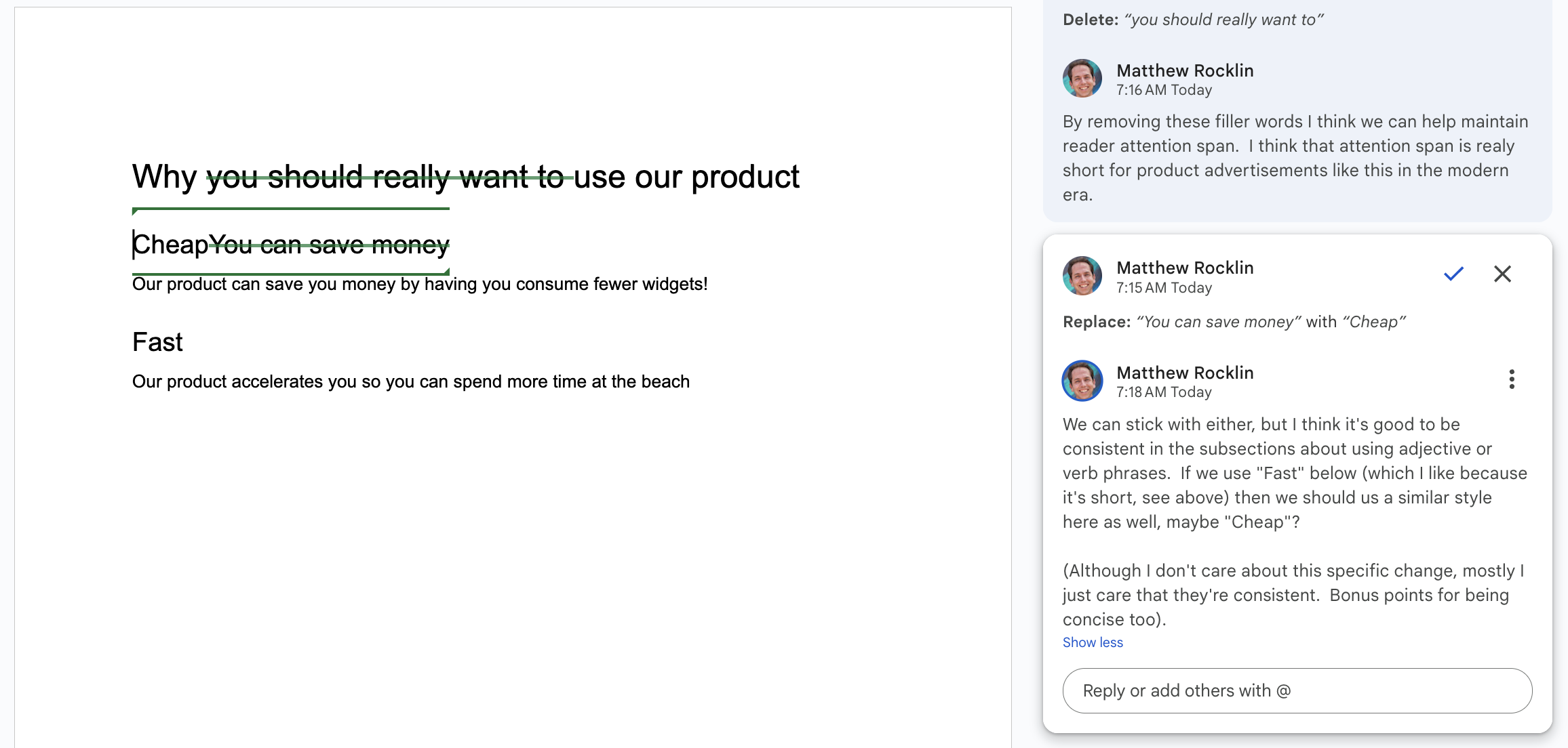 This same approach of highly detailed and thoughtful review does not transfer well to corporate contexts in my experience. As an example, let's consider the following exchange over a google doc: